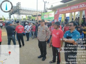 Pandeglang – Kapolsek Cikeusik, AKP Cecep, bersama anggotanya, melakukan pengamanan pertandingan sepak bola yang berlangsung di wilayahnya pada hari Senin (14/8). Pengamanan ini bertujuan untuk menjaga ketertiban dan memastikan acara berjalan dengan aman.